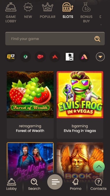 ロビーはカテゴリー別に整理されており、簡単に閲覧できます。ゲームはジャンル、スタジオ、そして「ドロップ&ウィンズ」や「ボーナスバイ」といった特定の機能で検索できます。