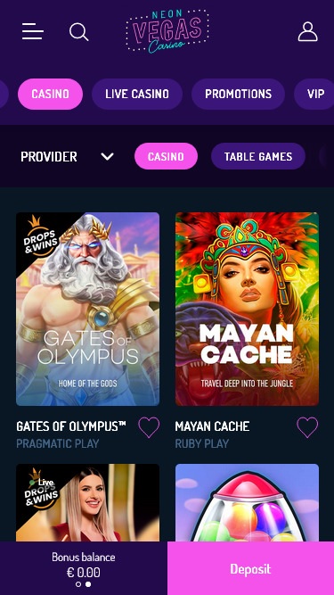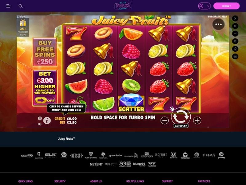 NeonVegasカジノは Microgaming, Net Entertainment, BetSoft, 1x2gaming, Big Time Gaming, ELK Studios, Evolution Gaming, lightningboxgames, Oryx, Play'n GO, playson, Quickspin, Rabcat, Relax Gaming, Yggdrasil, Wazdan, Booming Games, Pragmatic Play, Nolimit City, Felt Gaming, Red Tiger Gaming, Fantasma Games, FunFair, Kalamba, Spin Games, Triple Edge Studios, Northern Lights Gaming, Stormcraft Studios, Switch Studios, OneTouch, Electric Elephant Games, Pocket Games Soft, Bulletproof Games, All41 Studios, Gluck Games, Gameburger Studios, Pulse 8 Studios, Neon Valley Studios, Golden Rock Studios, Spearhead Studios, Swintt, SpinPlay Games, HungryBear Gaming, Real Dealer Studios, Blue Guru Games, Buck Stakes Entertainment, Elysium Studios, Games Global, 2by2 Gaming, bluberi, EveryMatrix, Push Gaming, Gamomat, Bally Wulff, Iron Dog Studio, Foxium, Just For The Win, Reflex Gaming, Storm Gaming Technology, PearFiction Studios, Wild Streak Gaming, Slingshot Studios, Golden Hero, Fortune Factory Studios, RubyPlay, 4ThePlayer, AvatarUX, Gamevy, Crazy Tooth Studio, ReelPlay, Japan Technicals Games, Alchemy Gaming, Black Pudding Games, Snowborn Games, Boomerang Studios, Hacksaw Gaming, Max Win Gaming, Gold Coin Studios, Bang Bang Games, Half Pixel Studios, Arcadem, SilverBack Gaming, Peter And Sons, Eurostar Studios, Aurum Signature Studios, Armadillo Studios, FlipLuck, Area Vegas, Leap Gaming, Wishbone Games, Spribe, Print Studios, Gaming Corps, HammerTime Games, INO Games, Nailed It! Games, Atomic Slot Lab, Neko Games, Reel Kingdom, Oros Gaming, JVL, Indigo Magic and NowNow Gamingを採用しており、サイトのゲームは操作性と視認性に優れたウェブベースのプラットフォームで提供されています。モバイルプレイにも対応しており、スマートフォンやタブレットでもプレイできます。Blackjack