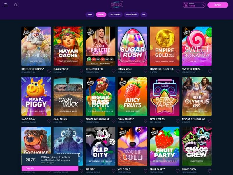 NeonVegasカジノは、マルタのBP Group Ltd.が運営するオンラインベッティングサイトです。80年代のレトロなネオンカラーを基調としたカジノは、膨大なスロットマシン、プログレッシブジャックポット、そして優れたカスタマーサポートチームを擁しています。これら全てが、NeonVegasをプレイヤーにとって素晴らしいカジノへと押し上げています。カジノ情報