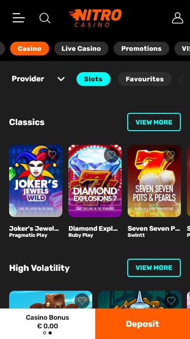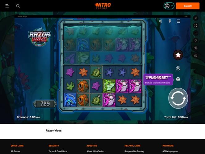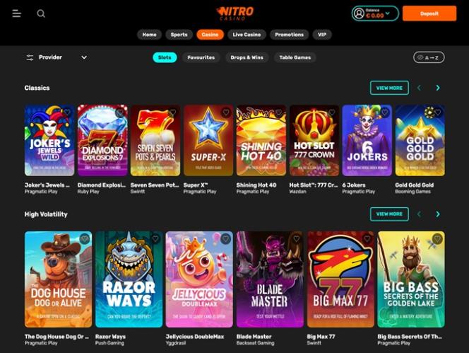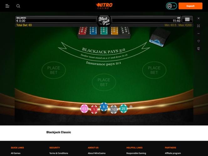 Nitro Casinoは Microgaming, Net Entertainment, BetSoft, 1x2gaming, Big Time Gaming, ELK Studios, Evolution Gaming, lightningboxgames, Oryx, Play'n GO, playson, Quickspin, Rabcat, Relax Gaming, Yggdrasil, Wazdan, Booming Games, Pragmatic Play, Nolimit City, Felt Gaming, Red Tiger Gaming, Fantasma Games, FunFair, Kalamba, Spin Games, Triple Edge Studios, Northern Lights Gaming, Stormcraft Studios, Switch Studios, OneTouch, Electric Elephant Games, Pocket Games Soft, All41 Studios, Gluck Games, Gameburger Studios, Pulse 8 Studios, Neon Valley Studios, Golden Rock Studios, Spearhead Studios, Swintt, SpinPlay Games, HungryBear Gaming, Real Dealer Studios, Blue Guru Games, PureRNG, Buck Stakes Entertainment, Elysium Studios, Games Global, 2by2 Gaming, Blueprint Gaming, EveryMatrix, Push Gaming, Gamomat, Bally Wulff, Iron Dog Studio, Foxium, Just For The Win, Reflex Gaming, Storm Gaming Technology, PearFiction Studios, Wild Streak Gaming, Slingshot Studios, Golden Hero, Fortune Factory Studios, RubyPlay, 4ThePlayer, AvatarUX, Gamevy, Crazy Tooth Studio, ReelPlay, Japan Technicals Games, Alchemy Gaming, Black Pudding Games, Snowborn Games, Boomerang Studios, Hacksaw Gaming, Max Win Gaming, Gold Coin Studios, Bang Bang Games, Half Pixel Studios, Arcadem, SilverBack Gaming, Peter And Sons, Eurostar Studios, Aurum Signature Studios, Armadillo Studios, Area Vegas, Leap Gaming, Wishbone Games, Spribe, Print Studios, Gaming Corps, HammerTime Games, INO Games, Nailed It! Games, Atomic Slot Lab, Neko Games, Reel Kingdom, Oros Gaming, JVL and Indigo Magicを採用しており、ブラウザで読み込まれるウェブベースのプラットフォームでサイトが展開されています。サイトは魅力的で操作しやすく、モバイルサポートも搭載されています。Blackjack