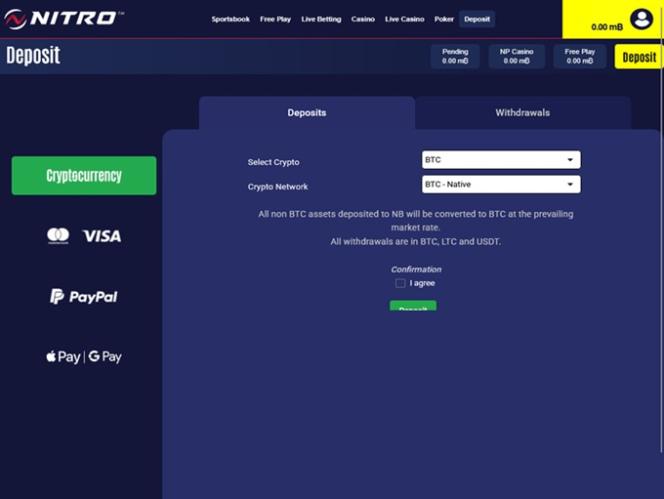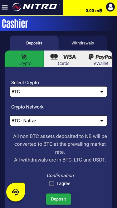 Nitrobetting Casinoは、イーサリアム、テザー、USDC、ライトコイン、ビットコイン、バイナンス、ビットコインキャッシュなど、数多くの暗号通貨に対応していますが、アカウントにはミリビットコイン(mBTC)が表示されます。入金は、暗号通貨決済オプション、クレジットカード、デビットカード、電子ウォレット、その他のオンライン決済システムから行うことができます。暗号通貨による入金は出金にのみご利用いただけます。