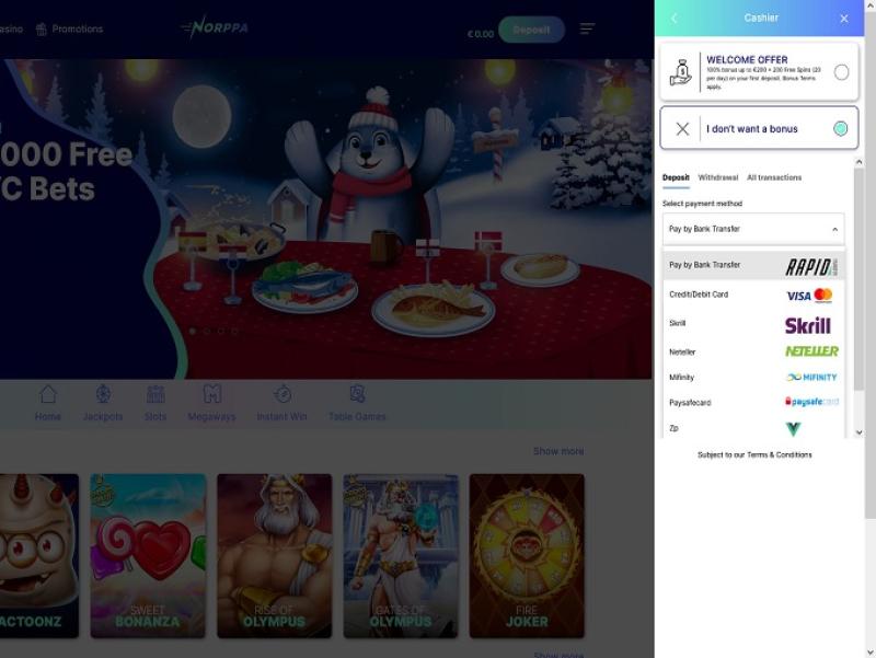 Norppaは前述の通り、暗号通貨対応のオンラインカジノであり、高速で信頼性の高い暗号通貨決済をサポートしています。従来の銀行決済を希望するプレイヤーは、人気のeウォレット、銀行振込、デビットカード、クレジットカードから選択できます。