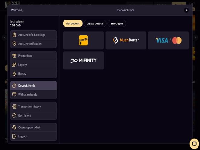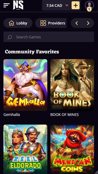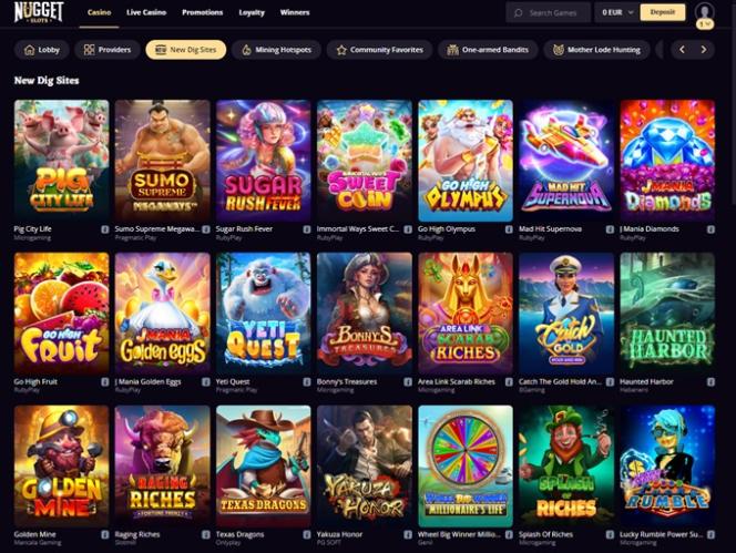 ウェブサイトの上部には水平メニューがあり、ユーザーはすべてのゲームカテゴリー、プロモーション、ロイヤルティプログラムを閲覧できます。そこから、NuggetSlots環境のほぼすべてのセクションに、迅速かつレスポンシブに移動できます。