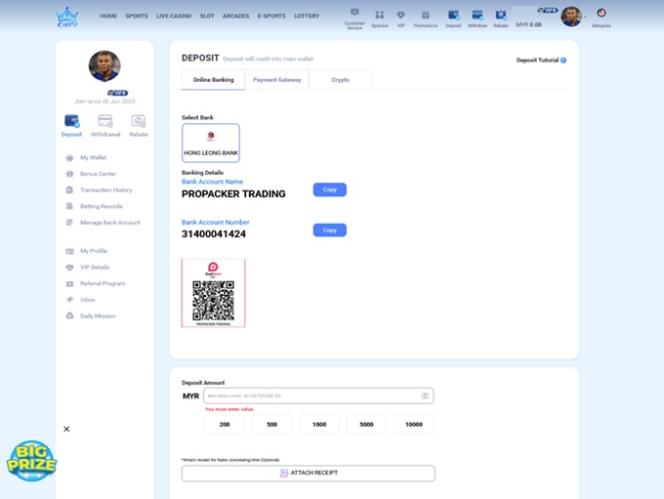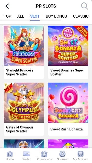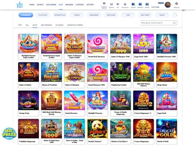 プラットフォームのホームページ上部には、すべてのゲームカテゴリーとカジノページに簡単にアクセスできる横長のメニューがあります。ここから、スポーツベッティング、ライブカジノタイトル、スロット、宝くじ、アーケード、プロモーション、VIPプログラム、カスタマーサービスに素早くアクセスできます。