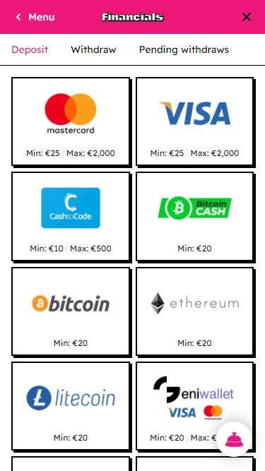 暗号通貨による決済方法に加え、プレイヤーはあらゆる種類の決済カード、直接送金、電子ウォレットなど、広く受け入れられている銀行決済方法をご利用いただけます。利用可能な決済方法は国によって異なります。