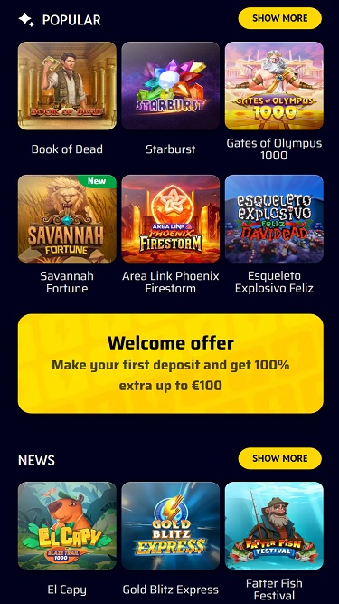 ウェブサイトのデザインにおいては、デザイナーはミニマリスト的なアプローチを極限まで追求し、プレイヤーがあらゆるカジノゲームやセクションを簡単に閲覧できる、非常にシンプルでありながらモダンな環境を提供しています。メインカラーパレットはダークな背景と黄色を基調としており、ユーザーインターフェースはシンプルで直感的です。