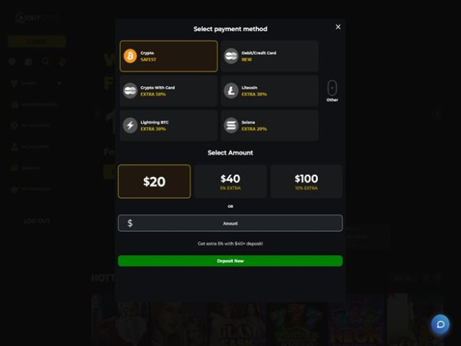 Orbit Spins Casinoは、米国およびその他の国々を対象としたオンラインギャンブルサイトです。豊富なゲーム数と、カジノボーナスを含む充実したプロモーションプランを提供しています。豊富なオンラインスロットに加え、テーブルゲームやライブディーラーオプションも提供しており、充実したギャンブル体験を提供します。ウェブサイトでは、従来の決済方法に加え、ビットコインなどの暗号通貨にも対応しているため、様々な方法で入出金が可能です。
