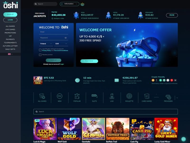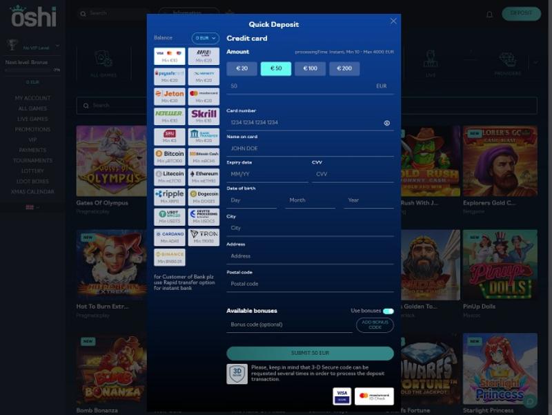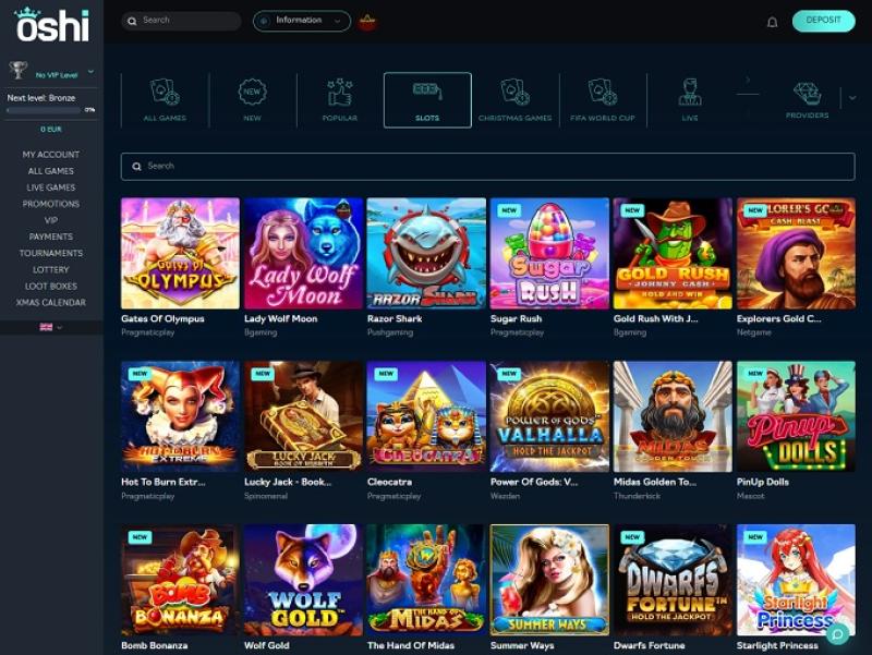 Oshi Casinoは Microgaming, Net Entertainment, Playtech, BetSoft, 1x2gaming, Amatic Industries, Big Time Gaming, ELK Studios, Evolution Gaming, Ezugi, Genesis Gaming, Habanero Systems, iSoftBet, lightningboxgames, Oryx, Play'n GO, playson, Quickspin, Rabcat, Relax Gaming, SOFTSWISS, Thunderkick, Vivo Gaming, Yggdrasil, Endorphina, Wazdan, Realistic Games, GameArt, Betgames, Booming Games, Pragmatic Play, Nolimit City, Red Tiger Gaming, Booongo, Spinomenal, Felix Gaming, Red Rake Gaming, Skillzzgaming, Fugaso, Belatra Games, Fantasma Games, FUGA Gaming, Kalamba, Revolver Gaming, Platipus Gaming, Nucleus Gaming, Triple Edge Studios, BGAMING, Northern Lights Gaming, Evoplay, Stormcraft Studios, IGTech, Switch Studios, OneTouch, Electric Elephant Games, Pocket Games Soft, Dreamtech Gaming, Bulletproof Games, All41 Studios, Gluck Games, August Gaming, Mascot Gaming, TVBet, NetGame Entertainment, Gameburger Studios, Pulse 8 Studios, Neon Valley Studios, Golden Rock Studios, Spearhead Studios, Swintt, TrueLab Games, SpinPlay Games, Mancala Gaming, HungryBear Gaming, SmartSoft Gaming, KA Gaming, Atmosfera, Holle Games, Pipa Games, Caleta Gaming, Games Global, Reevo, Amusnet Interactive, Wizard Games, 2by2 Gaming, Ainsworth, CT Interactive, Igrosoft, Leander Games, NextGen, Pariplay, Probability, Push Gaming, Tom Horn Gaming, Gamomat, Mr Slotty, Authentic Gaming, Iron Dog Studio, Old Skool Studios, Foxium, Just For The Win, Reflex Gaming, Storm Gaming Technology, PearFiction Studios, Wild Streak Gaming, Slingshot Studios, Golden Hero, Fortune Factory Studios, Jade Rabbit Gaming, Green Jade Games, STHLM Gaming, 4ThePlayer, AvatarUX, Gamevy, Crazy Tooth Studio, High 5 Games, ReelPlay, Alchemy Gaming, Plank Gaming, BB Games, Black Pudding Games, Snowborn Games, Boomerang Studios, Hacksaw Gaming, Max Win Gaming, Gold Coin Studios, Bang Bang Games, Gamzix, Half Pixel Studios, Slotmill, SilverBack Gaming, Absolute Live Gaming, Aurum Signature Studios, Onlyplay, Armadillo Studios, Gamebeat, Playgon, Bombay Live, Winfinity, 3 Oaks Gaming, Popiplay, Live88 and Zillion Gamesを採用しており、カジノのゲームはウェブベースのインスタントプレイプラットフォームを通じて提供されます。このプラットフォームはインターネットブラウザから直接読み込み可能です。モバイルサポートも提供されており、スマートフォンやタブレットのプレイヤーは外出先でもゲームをプレイできます。
