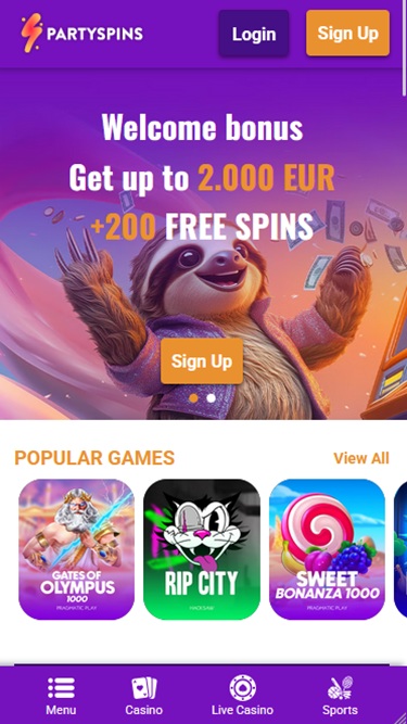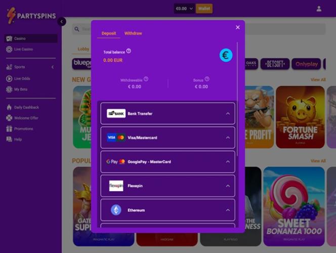 プラットフォームには、左側にメインメニューがあり、カジノ、ライブカジノ、スポーツ、ライブオッズ、マイベット、デイリーキャッシュバック、ウェルカムオファー、プロモーション、ヘルプといったカテゴリーがあります。ただし、プレイヤーダッシュボードにアクセスするには、いつものように、まずアカウントを作成し、PartySpinsコミュニティに参加する必要があります。登録手続きは4つのステップに分かれていますが、登録は数分で完了し、一般的な個人情報を入力するだけです。