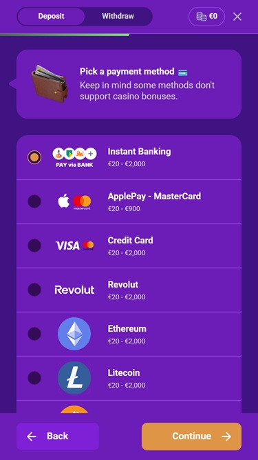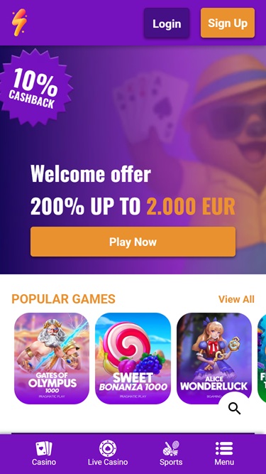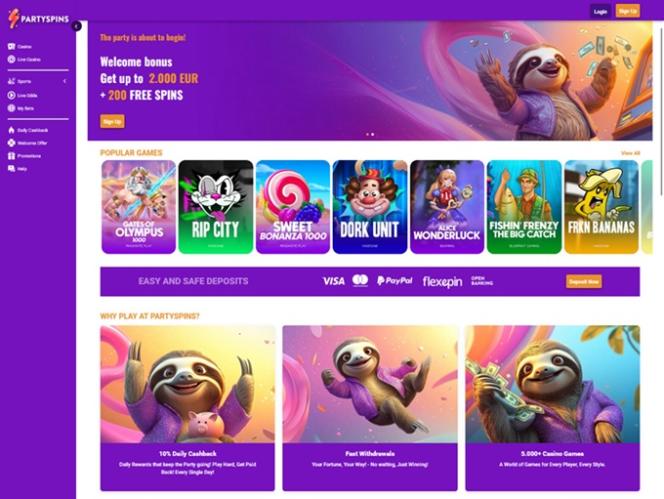 とても素敵なカジノで、興味深いグラフィックが施されています。満面の笑みを浮かべたナマケモノがマスコットとして描かれ、ウェブサイトのカラーに合わせたキラキラした紫色のジャケットを着ています。このカジノは本物で、本当に美しく、多くのオンラインカジノプレイヤーの心を掴むと確信しています。