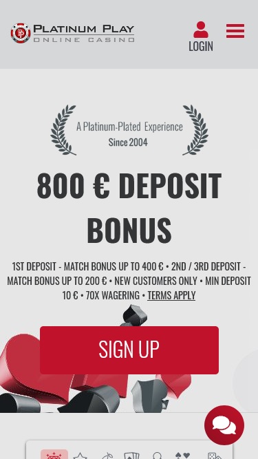 Platinum Play Casinoは2003年に設立されたオンラインカジノで、20近くの高い評価を得ているオンラインベッティンググループDigimediaによって運営されています。Platinum Playでプレイするプレイヤーは、優れた運営、高額ジャックポット、そして膨大なゲームライブラリを高く評価しています。