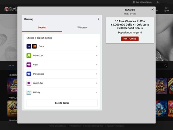 Platinum Play Casinoは Microgaming, Net Entertainment, Evolution Gaming, Pragmatic Play, Red Tiger Gaming, Triple Edge Studios, Northern Lights Gaming, Stormcraft Studios, Switch Studios, All41 Studios, Gameburger Studios, Pulse 8 Studios, Neon Valley Studios, SpinPlay Games, Real Dealer Studios, GONG Gaming, On Air Entertainment, Buck Stakes Entertainment, Games Global, Old Skool Studios, Foxium, Just For The Win, PearFiction Studios, Wild Streak Gaming, Slingshot Studios, Fortune Factory Studios, Crazy Tooth Studio, Alchemy Gaming, Snowborn Games, Gold Coin Studios, Half Pixel Studios, Eurostar Studios, Aurum Signature Studios, Area Vegas, Wishbone Games, Circular Arrow, HammerTime Games, Nailed It! Games, Neko Games, Reel Kingdom and Oros Gamingを採用しており、スロット、テーブルゲーム、ビデオポーカーなど、数百ものゲームを提供しています。カジノはウェブベースのプラットフォームとダウンロード可能なソフトウェアクライアントの両方で利用可能です。どちらのプレイ方法もほぼ同じで、レイアウトに時折異なる画像が表示されることを除けば、プレイヤーは違いに気付くでしょう。モバイルサイトを通じてモバイルプレイもサポートされており、スマートフォンやタブレットでプレイできます。