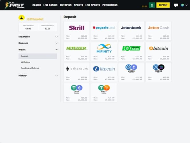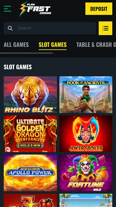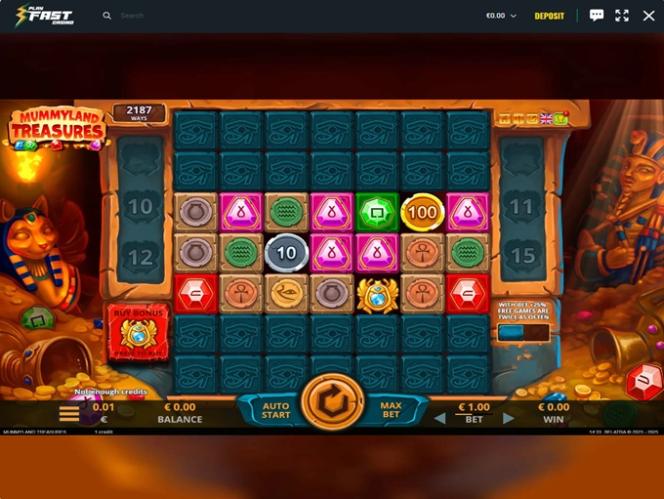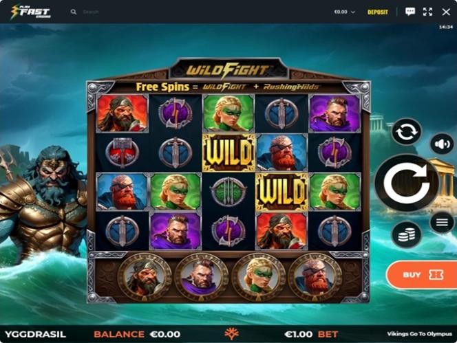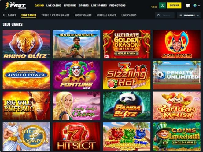 PlayFastには、Buffalo Rampage、Lucky Mr. Patrick、Magical Amazon、Book of the Divine、Book of Clovers、Goddess of Lotus、Joker Win、4 Horseman II、Age of Pirates、Braindead、Mancala Quest、Crystal Mine、Portal Master、Starwins、Coco Tiki、Cherry Bombs、Zero Day、Noche Oscura、Wicked Heart、Monster Thieves、Copper Dragon、Club Garage、Gun's Heat、Voodoo Spells、#Casino Night、Green&Greedy、Blood Romance、Rage of Zeus、Western Tales、Wildfire Fruits、Wacky Monkey、1 Reel Egypt、Trojan Tales、Book of Champions Reloaded、Winners Gold、Book of the Divine Reloaded、Poseidon's Rising、Book of Demi Gods III、Beer Collection、Fruits Collection、Egyptian Eclipse、Titan's Risingなど、人気タイトルが満載のスロットセクションがあります。 Book of Champions、African Rampage、Story of the Samurai、Queen of Fire、Aztec Spell など。