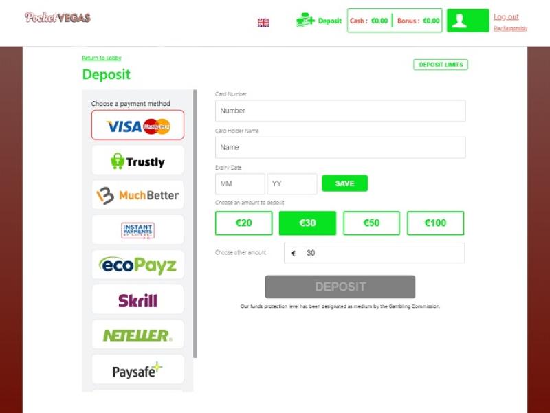 Pocket Vegasカジノの利用規約をよく確認したところ、プレイヤーに対して不公平または搾取的な点は見当たりません。Pocket Vegasの銀行システムは堅牢で、入金・出金にはMasterCard、Visa、Maestro、Skrillが利用可能です。また、Boku、Solo、Paysafecardでも入金可能です。出金スピードは良好ですが、3日間の保留期間と1日あたりの出金上限額10,000ポンドが設定されています。