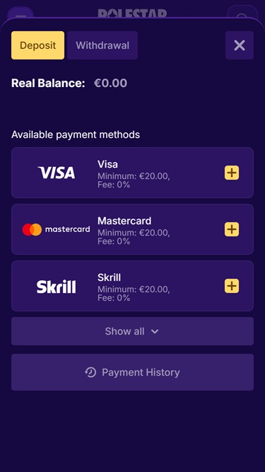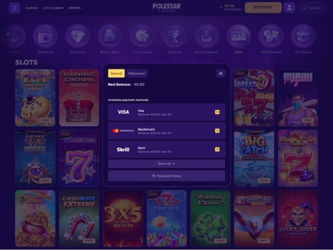 Polestar Casinoは、プレイヤーの入金と出金に利用可能な幅広い決済方法をサポートしています。クレジットカード、デビットカード、 Neteller、Skrillといった一般的な銀行決済に加え、その他の信頼できる電子ウォレットやオンライン決済システムなど、様々な決済方法からお選びいただけます。また、デジタルコインを使ったギャンブルを好むプレイヤーのために、暗号通貨での決済オプションも提供しています。