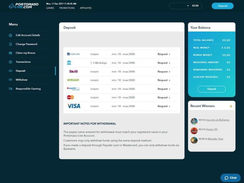 Portomaso Live Casinoの利用規約をよく読んでみると、プレイヤーを搾取したり不公平に扱ったりするような点は見当たりません。カジノの決済手段は充実しており、銀行送金、Visa、Skrill、Netellerによる入出金が可能です。MasterCard、Paysafecard、WebMoney、iDealも利用可能です。入金は瞬時に行われ、出金も迅速に処理されます。eWalletは即時処理ですが、その他のeWalletは数時間から数日かかる場合があります。
