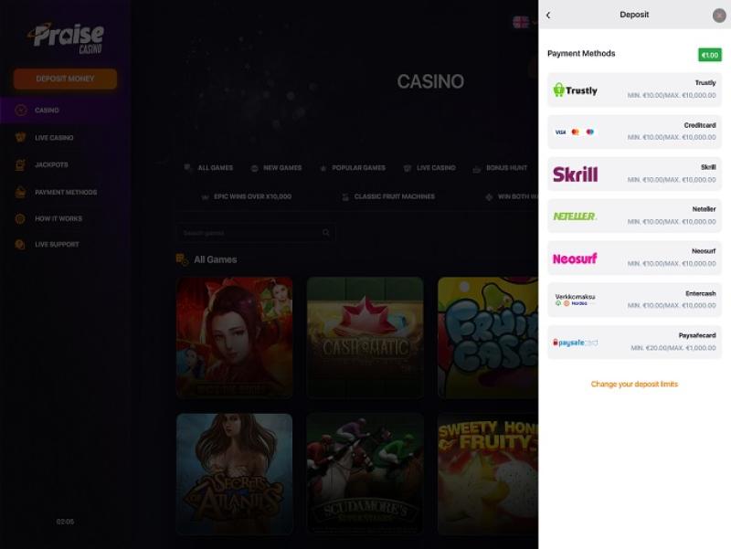 以下に、入金方法から出金方法に至るまで、Praise Casino の銀行オプションの詳細を示します。