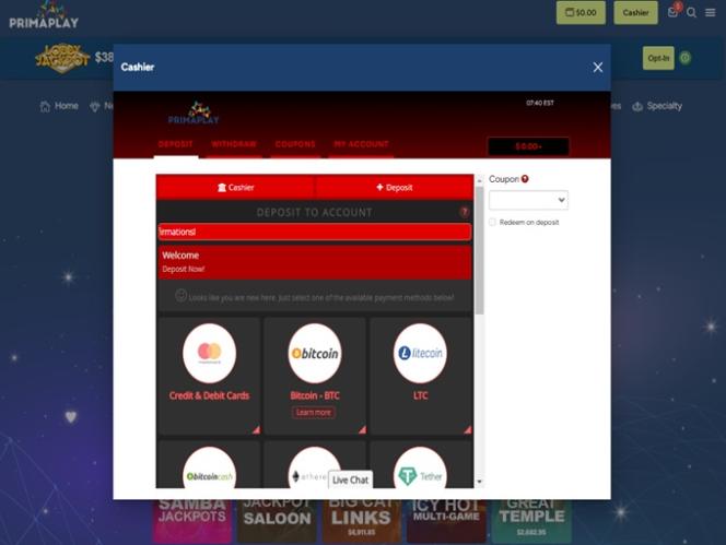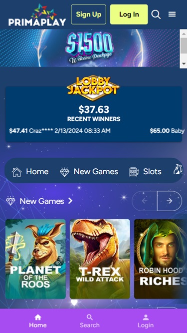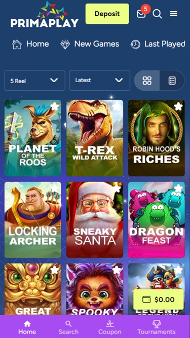 Prima Play Casinoは Real Time Gaming and Spinlogic Gamingを採用しており、インターネットブラウザで読み込まれるウェブベースのプラットフォームを使用しています。サイトの見た目は良いのですが、スクロール時のナビゲーションが少し遅いと感じました。モバイルプレイにも対応しており、スマートフォンやタブレットでもプレイできます。