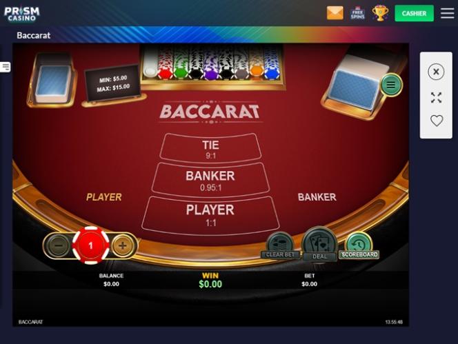 Prism Casino は Real Time Gaming and Spinlogic Gamingを搭載しており、プレイヤーはダウンロード可能なソフトウェアを通じて、また Web ブラウザから直接プレイできる Web ベースのプラットフォームを通じてカジノにアクセスできます。Baccarat