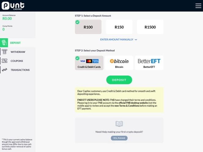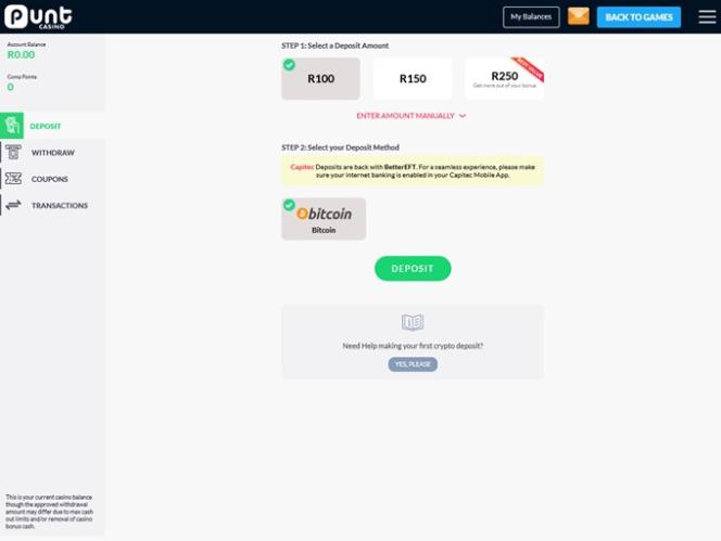 Punt Casinoのバンキングシステムは十分に整備されており、クレジットカード、eWallet、ビットコインでの入出金が可能です。ビットコインは資金を最も早く受け取ることができるので、おすすめです。賞金の出金には24時間の保留時間があり、VIPプレイヤークラスに応じて出金限度額が異なります。