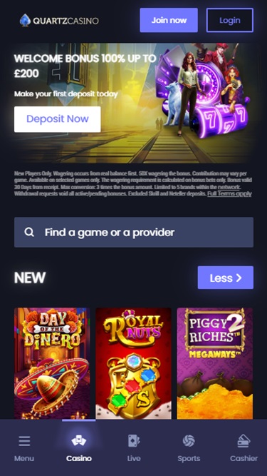 Quartz Casino は、2014 年に初めてオープンしたオンライン ベッティング サイトです。ProgressPlay Limited によって運営および所有されている Quartz Casino は、ProgressPlay が所有する他のカジノと似た外観と雰囲気を備えていますが、大規模なゲーム ライブラリ、堅実な所有権、安定した支払い履歴を提供し、そのすべてが Quartz を、完全に革新的ではないにしても、優れたオンライン ベッティング サイトにしています。カジノ情報