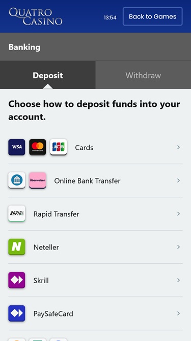 Quatro Casinoは Microgaming, Evolution Gaming, Rabcat, Pragmatic Play, Triple Edge Studios, Northern Lights Gaming, Stormcraft Studios, Switch Studios, Electric Elephant Games, All41 Studios, Gameburger Studios, Pulse 8 Studios, Neon Valley Studios, SpinPlay Games, Real Dealer Studios, GONG Gaming, On Air Entertainment, Buck Stakes Entertainment, Games Global, Old Skool Studios, Foxium, Just For The Win, PearFiction Studios, Slingshot Studios, Fortune Factory Studios, Crazy Tooth Studio, Alchemy Gaming, Snowborn Games, Gold Coin Studios, Half Pixel Studios, Eurostar Studios, Aurum Signature Studios and Area Vegasによって運営されており、様々なオンラインカジノゲームをプレイヤーに提供しています。カジノソフトウェアはウェブベースのプラットフォームで提供されるほか、ダウンロード可能なクライアントも提供されており、パソコンに直接インストールすることも可能です。また、豊富なゲームセレクションを誇るモバイルゲームサイトのおかげで、モバイルデバイスからもQuatro Casinoをプレイできます。Blackjack