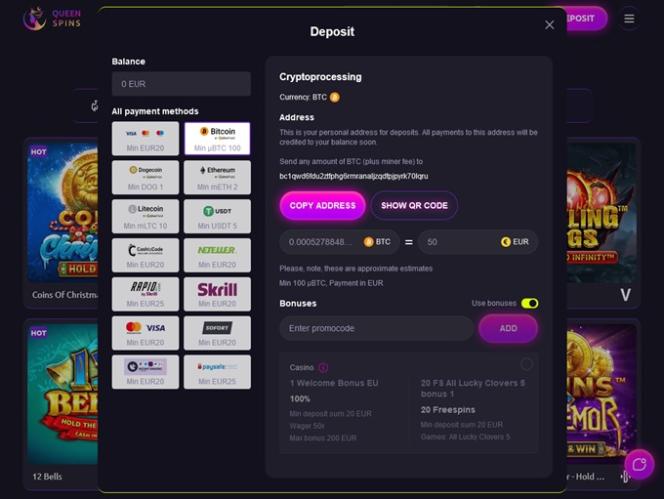 Queenspins カジノで利用できる入金および出金方法は次のとおりです。