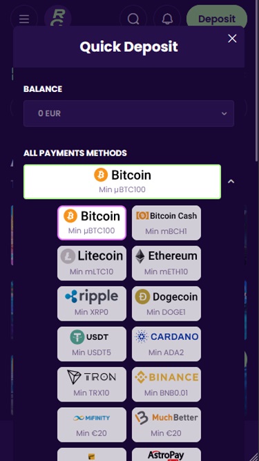 最新の暗号通貨を使用してカジノアカウントとの間で送金するオプションもあり、利用可能な通貨はCardano 、 Bitcoin 、 Bitcoin Cash 、 Dogecoin 、 Ethereum 、 Tron 、 Tether 、 Rippleです。