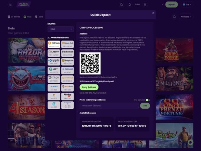 ライブラリにはソフトウェア開発会社の幅広い選択肢が揃っているので、オンラインスロットを好むプレイヤーは、様々なスロットマシンを見つけてプレイする絶好の機会を得ることができます。Ready Casinoで最も人気のあるタイトルは、Gates of Olympus 1000、Fire Joker、Viking Forge、Buffalo King Megaways、Chilli Heat Megaways、Book of Ra、Elvis Frog in Vegas Hold and Win、Coin Volcano Hold and Win 3x3、Rich Wilde and the Book of Dead、Big Bass Bonanza、Reactoonz、Sweet Bonanzaです。