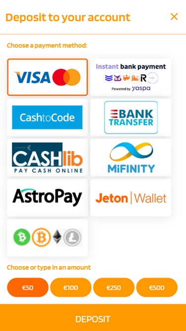 サポートされている方法は国によって異なり、一部の支払いオプションはギャンブルの管轄区域では利用できない可能性があることに注意してください。
