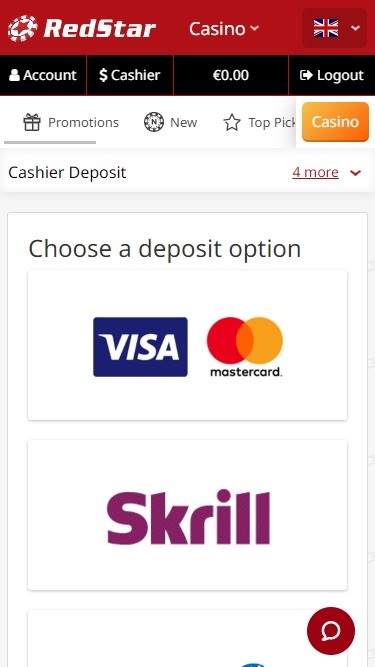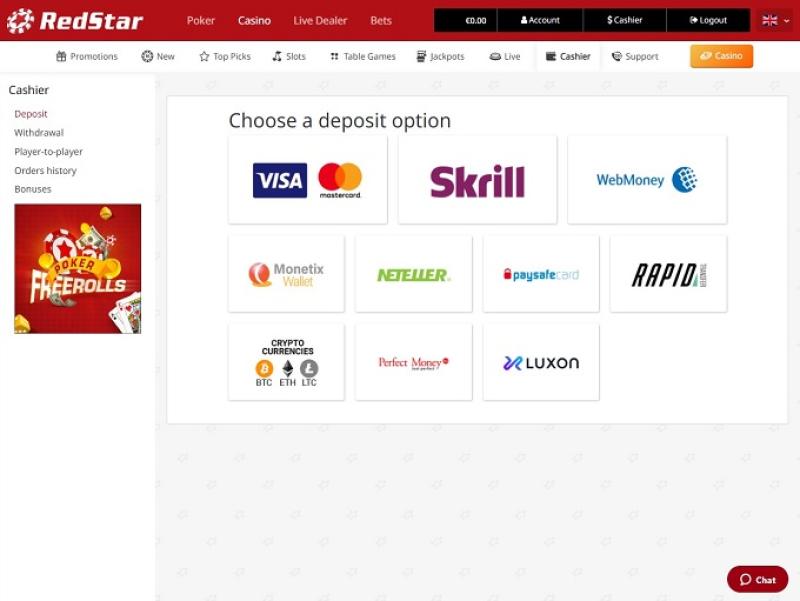 RedStar Casinoのバンキングシステムは、期待するほど速くはないものの、まずまずの出来です。Skrill、Neteller、Visa、WebMoney、Moneta.ruでの入出金に加え、Bitcoin、OKPay、SOFORT、MasterCard、Paysafecardでの入金が可能です。入金には、選択した方法に応じて最大7営業日かかる場合があります。また、1週間あたりの出金限度額は9,000ドルです。
