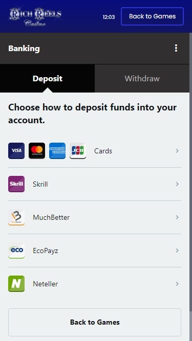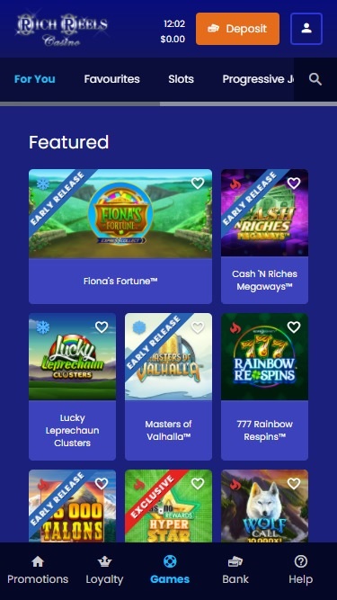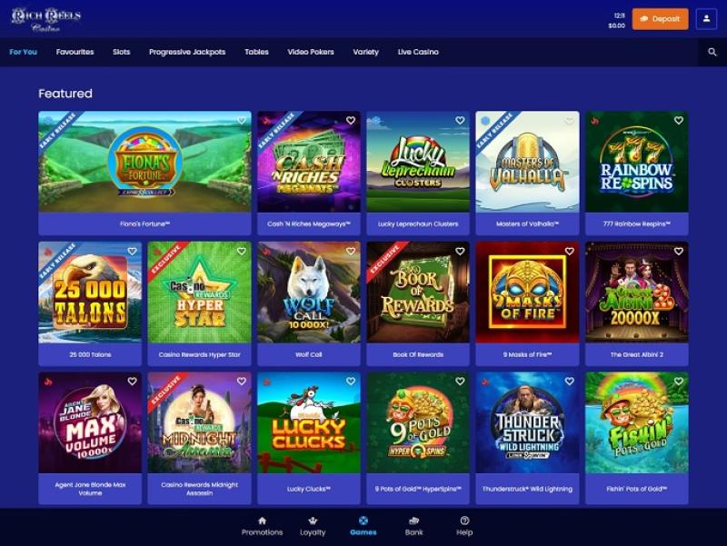 Rich Reels Casinoは Microgaming, Evolution Gaming, Rabcat, Pragmatic Play, Triple Edge Studios, Northern Lights Gaming, Stormcraft Studios, Switch Studios, Electric Elephant Games, All41 Studios, Gameburger Studios, Pulse 8 Studios, Neon Valley Studios, SpinPlay Games, Real Dealer Studios, GONG Gaming, On Air Entertainment, Buck Stakes Entertainment, Games Global, Old Skool Studios, Foxium, Just For The Win, PearFiction Studios, Slingshot Studios, Fortune Factory Studios, Crazy Tooth Studio, Alchemy Gaming, Snowborn Games, Gold Coin Studios, Half Pixel Studios, Eurostar Studios, Aurum Signature Studios and Area Vegasを採用しており、数百ものゲームを提供しています。Microgaming社はカジノのプラットフォームも提供しており、ダウンロード可能なソフトウェアクライアントに加え、ウェブブラウザから直接ゲームをプレイできる優れたウェブプラットフォームも提供しています。モバイルデバイスでプレイしたい方は、Rich Reelsのモバイルベッティングサイトからプレイできます。Blackjack