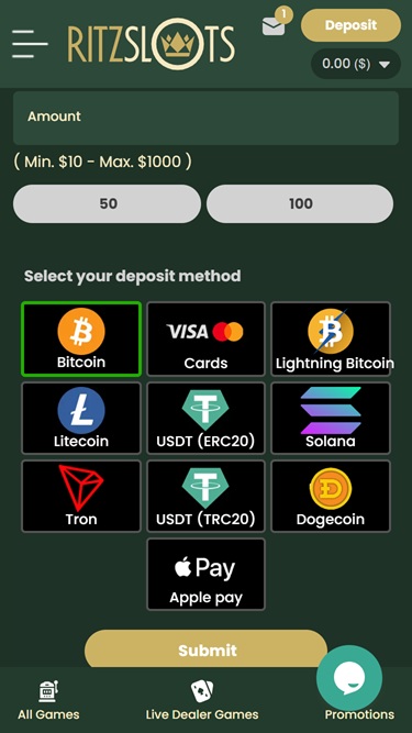 カジノのキャッシャーは暗号通貨による支払いのみをサポートしており、ビットコイン、テザー、イーサリアム、ライトコインなどのさまざまな暗号通貨やその他の一般的なオプションで入金と出金が可能です。