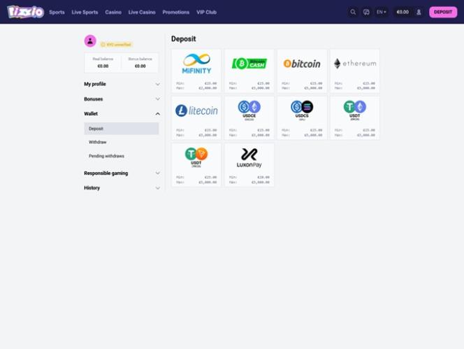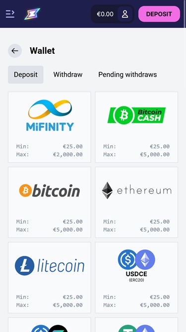 入金と出金には、 Visa 、 Mastercard 、 Apple Pay 、Google Pay、銀行振込、Skrill、MiFinity、Neosurfなど、様々な決済方法をご利用いただけます。さらに、ビットコイン、ビットコインキャッシュ、イーサリアム、ライトコイン、 USD Coin 、テザーなど、様々な暗号通貨もご利用いただけます。