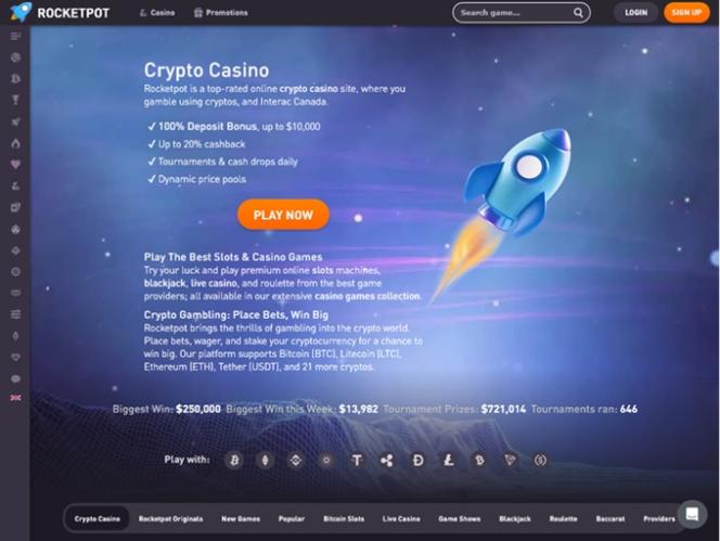 Rocketpot Casinoは、すべての会員に最高の体験を提供することを目標とする、暗号資産対応の定評あるオンラインカジノです。世界有数のソフトウェアプロバイダーが提供する3,000以上の素晴らしいゲームに加え、様々なボーナスやプロモーションでゲームプレイをさらに盛り上げます。