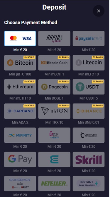 入金・出金には、様々な決済方法をご利用いただけます。従来の決済方法としては、 Visa 、 Mastercard 、 Apple Pay 、 Google Pay 、 Neteller 、 Skrill 、 Neosurf 、 MiFinity 、銀行振込などが挙げられます。一方、最新の決済方法としては、ビットコイン、ビットコインキャッシュ、ライトコイン、テザー、トロン、ドージコイン、カルダノといった暗号通貨がご利用いただけます。