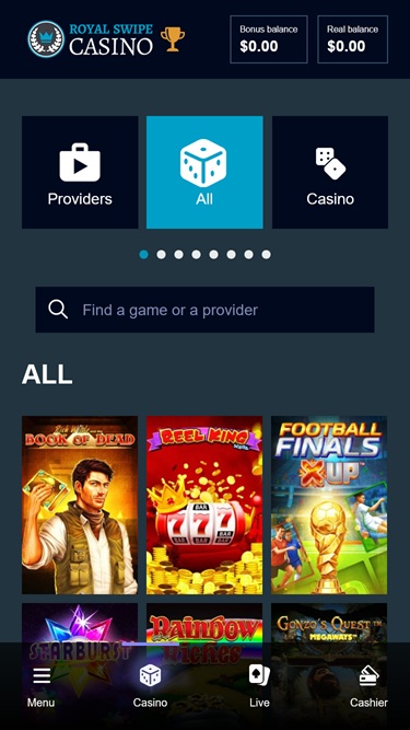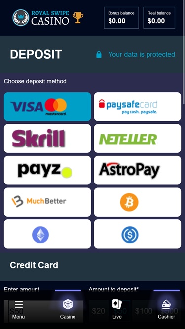 Royal Swipe Casinoは Amaya, Microgaming, Net Entertainment, Playtech, 1x2gaming, Barcrest, Big Time Gaming, ELK Studios, Evolution Gaming, EYECON, lightningboxgames, Play'n GO, Quickspin, Rabcat, Thunderkick, Wazdan, Realistic Games, Pragmatic Play, Nolimit City, Red Tiger Gaming, LuckyStreak, Spinomenal, Skillzzgaming, Fugaso, Fantasma Games, SYNOT Games, Skywind, Triple Edge Studios, Northern Lights Gaming, Stormcraft Studios, Switch Studios, All41 Studios, Gluck Games, Gameburger Studios, Pulse 8 Studios, Slot Factory, Neon Valley Studios, Shuffle Master, SpinPlay Games, KA Gaming, Real Dealer Studios, GONG Gaming, On Air Entertainment, Buck Stakes Entertainment, Games Global, 2by2 Gaming, Ash Gaming, Blueprint Gaming, NextGen, NYX Interactive, ProgressPlay, Tom Horn Gaming, WMS, Inspired Gaming, SG Interactive, Red7Mobile, Scientific Games, Reel Time Gaming, BF Games, Iron Dog Studio, Old Skool Studios, Foxium, Betdigital, Just For The Win, PearFiction Studios, Wild Streak Gaming, Slingshot Studios, Fortune Factory Studios, Gamevy, Crazy Tooth Studio, ReelPlay, Alchemy Gaming, Rarestone Gaming, Black Pudding Games, Snowborn Games, Hacksaw Gaming, Max Win Gaming, Gold Coin Studios, Bang Bang Games, Half Pixel Studios, Eurostar Studios, Aurum Signature Studios, Lucksome Gaming, Area Vegas, Leap Gaming, TaDa Gaming, Wishbone Games, Circular Arrow, HammerTime Games, INO Games, Nailed It! Games, Neko Games, Reel Kingdom, Oros Gaming, Light & Wonder and Playziaによって運営されており、Webベースのプラットフォームを通じてプレイヤーにゲームを提供しています。スマートフォンやタブレットでゲームをプレイしたい方のために、モバイルサイトもご用意しています。Blackjack