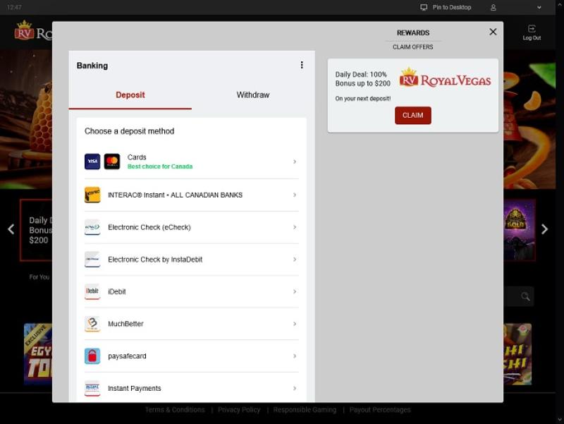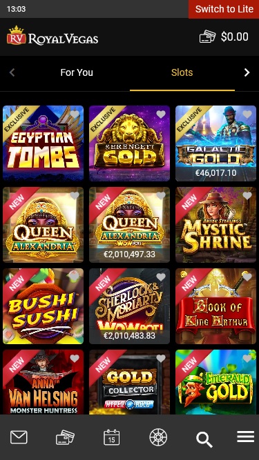Royal Vegas Casinoは Microgaming, Net Entertainment, Evolution Gaming, Rabcat, Pragmatic Play, Red Tiger Gaming, Triple Edge Studios, Northern Lights Gaming, Stormcraft Studios, Switch Studios, Electric Elephant Games, All41 Studios, Gameburger Studios, Pulse 8 Studios, Neon Valley Studios, SpinPlay Games, Real Dealer Studios, GONG Gaming, On Air Entertainment, Buck Stakes Entertainment, Games Global, OpenBet, Old Skool Studios, Foxium, Just For The Win, PearFiction Studios, Wild Streak Gaming, Slingshot Studios, Fortune Factory Studios, Crazy Tooth Studio, Alchemy Gaming, Snowborn Games, Gold Coin Studios, Half Pixel Studios, Eurostar Studios and Aurum Signature Studiosを採用しており、プレイヤーに数百ものカジノゲームの選択肢を提供しています。カジノはダウンロード可能なソフトウェアクライアントと、ウェブブラウザでゲームをプレイできるFlashベースのプラットフォームの両方でご利用いただけます。