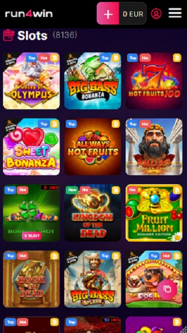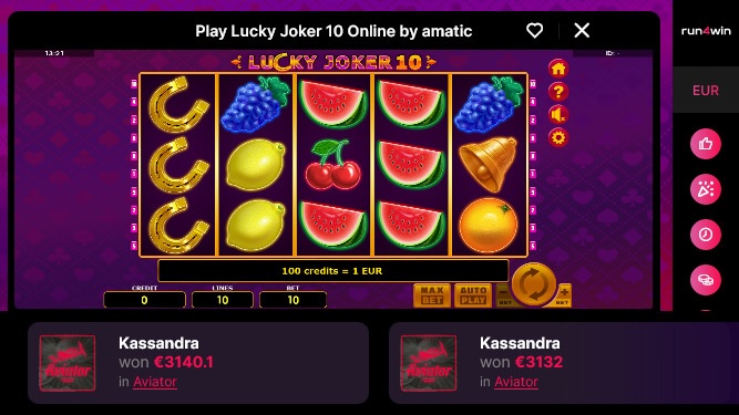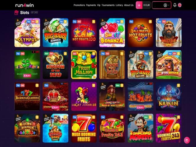 Run4Winには、オンラインスロットの豊富なタイトルが揃っています。中でも人気が高いのは、Midas Golden Touch、777 Burning Classics、Fruit Million Summer Edition、7 Mega Booming Fruits、Ultra Fresh、7 Fortune Threeなどです。6,300タイトル以上からお選びいただけます。