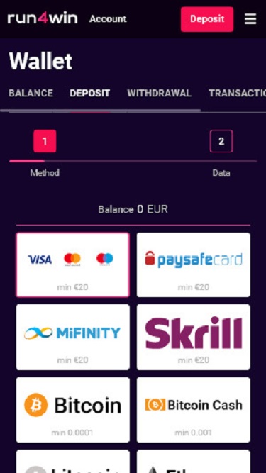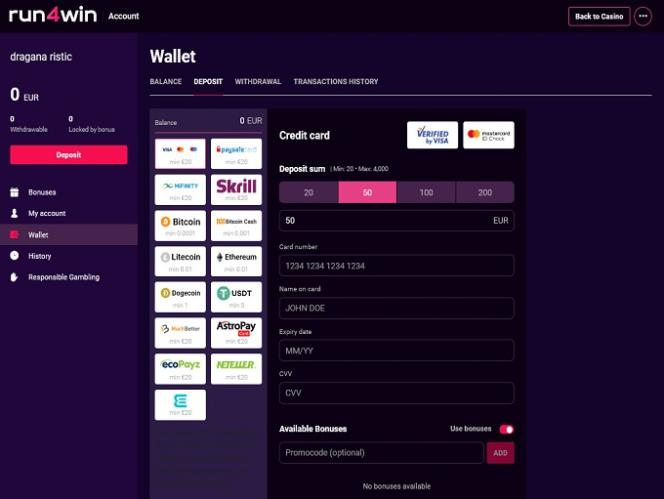 Run4Win カジノには豊富な銀行オプションがあり、プレイヤーは支払い方法として暗号通貨のほか、Visa、Mastercard、Neteller、Skrill、銀行電信送金、Astropay などの一般的な方法も使用できます。