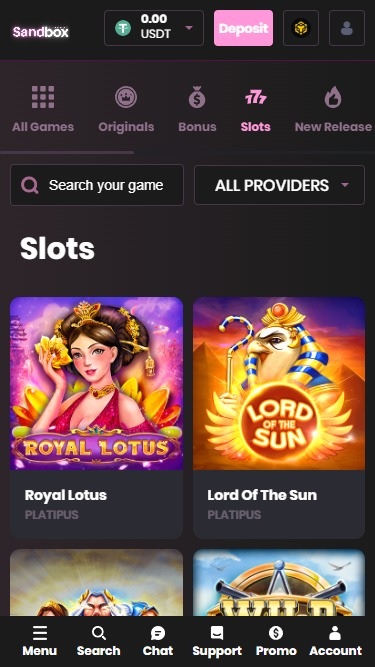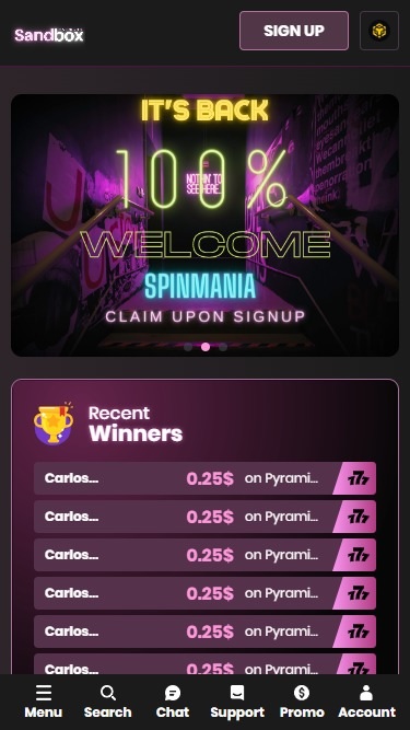 SandBoxのサイトはクロスデバイス対応なので、ソファでゆったりとギャンブルを楽しみたいプレイヤーには、きっと気に入っていただけるでしょう。デスクトップ版も同様に美しく表示されますが、このバージョンのホームページはオンラインカジノのコンテンツをすべて左揃えで表示するように設計されているため、ページから何かが欠けているような印象を与えます。そのため、全体的な印象はやや低下しました。他のページでは異なる表示方法を使用しているので、その点は心配ありません。一見すると、SandBoxは素晴らしいギャンブルサイトのように見えます。