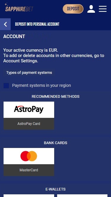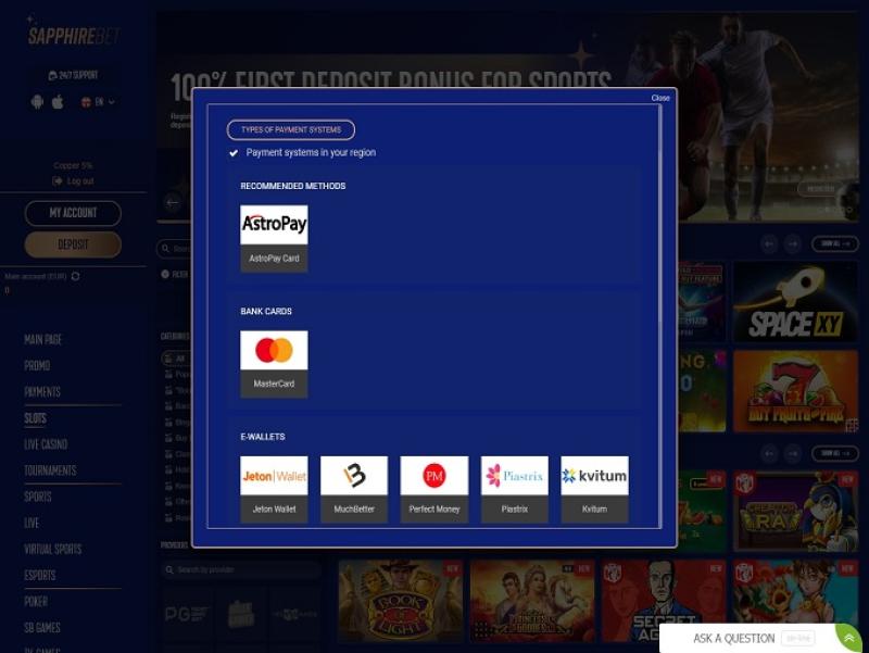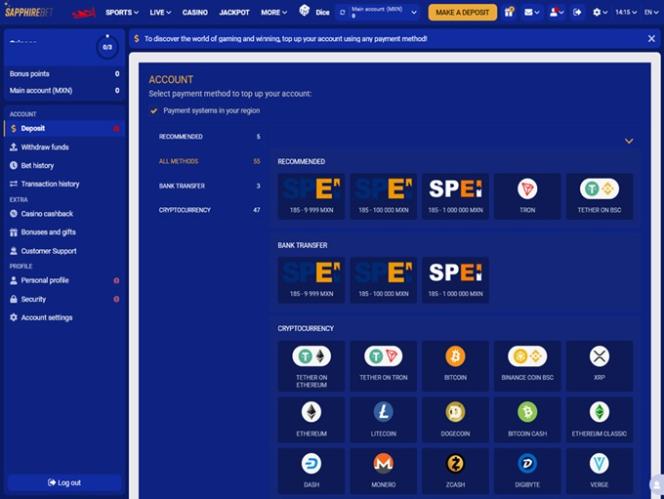 Sapphirebetのプレイヤーは、カジノアカウントへの入金と出金に、 Visa 、 Mastercard 、 Jeton 、 Neosurf 、 Payz 、 Flexepin 、 MuchBetter 、 Paytm 、 Astropayなどの多数の銀行オプションのほか、 Bitcoin 、 Bitcoin Cash 、 Cardano 、 Dogecoin 、 Polkadot 、 Ethereum 、 Litecoin 、 Tron 、 USD Coin 、 Tether 、 Rippleなどの複数の暗号通貨を利用できます。
