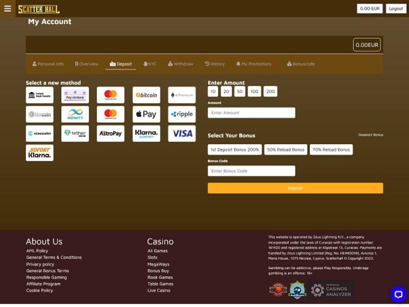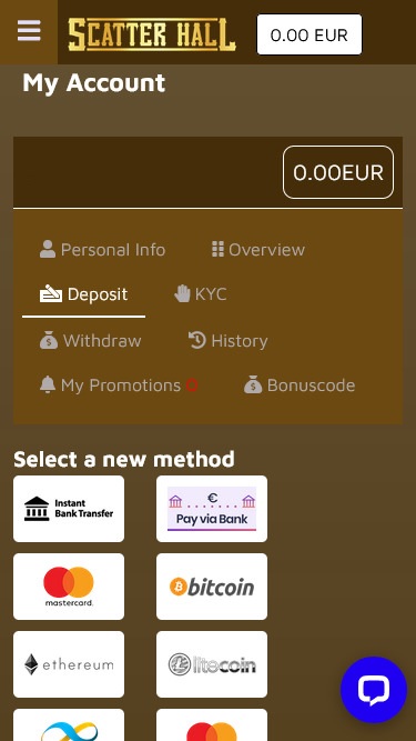 Scatter Hall Casinoは、暗号通貨を含む様々な決済方法に対応しています。ただし、入金と出金に利用できる決済方法は国によって異なるため、ご自身に最適な方法を選択するようにしてください。