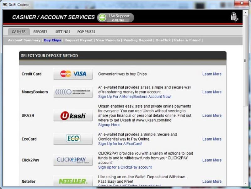 SciFi Casinoは、カジノオーナーが開発した独自のベッティングソフトウェア Playsafeを採用しています。このソフトウェアはダウンロード可能なソフトウェアとして入手可能ですが、インスタントプレイプラットフォームが存在しないようです。そのため、ほとんどのサイトが何らかのインスタントプレイモデルを提供しているのに対し、SciFi Casinoは他のサイトに比べて劣勢となっています。での銀行オプション SciFi Casino