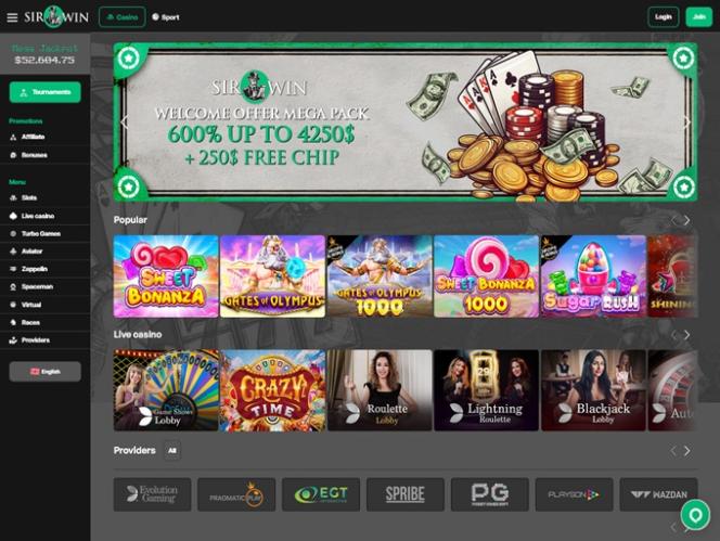 このギャンブルプラットフォームには、魅力的なカジノとスポーツセクションがあります。カジノセクションのメニューは、スロット、ライブカジノ、ゲーム、アビエイター、ツェッペリン、スペースマン、バーチャル、レース、プロバイダーに分類されています。