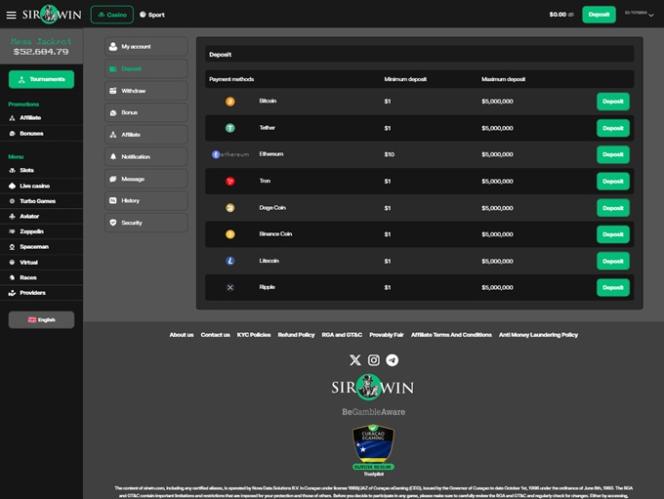 SirWin Casinoは、主にカナダ、フィンランド、ドイツに拠点を置くプレイヤーを対象としたオンラインカジノおよびスポーツベッティング運営会社です。このウェブサイトは、キュラソー島の法律に基づいて設立され、キュラソー島政府からライセンスと規制を受けている会社が所有しています。