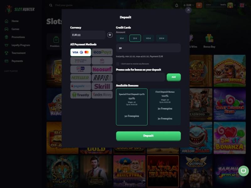 Slot Hunterには充実したスロットライブラリがあり、数十社の異なる開発会社による2,200以上のゲームが揃っています。NetEnt、Microgaming、WMS、Yggdrasilなど、数々のゲームが揃っています。豊富なゲームからお選びいただけ、プログレッシブジャックポットやモバイルスロットもご用意しています。