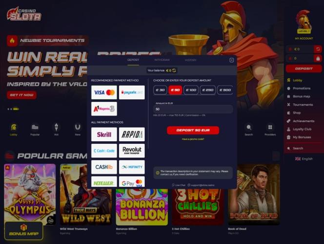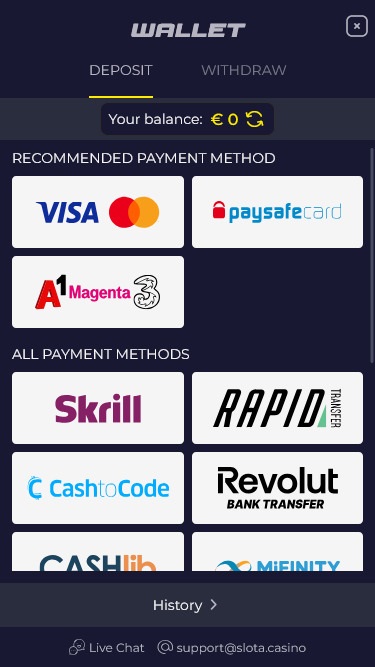 Slota Casinoは、ユーザーに幅広い決済手段を提供することを目指しています。そのため、プレイヤーは様々な銀行決済手段を利用して入金・出金できます。標準的な決済方法としては、 Visa 、 Mastercard 、 Skrill 、 Neteller 、 MiFinity 、 Google Pay 、銀行振込などが挙げられます。