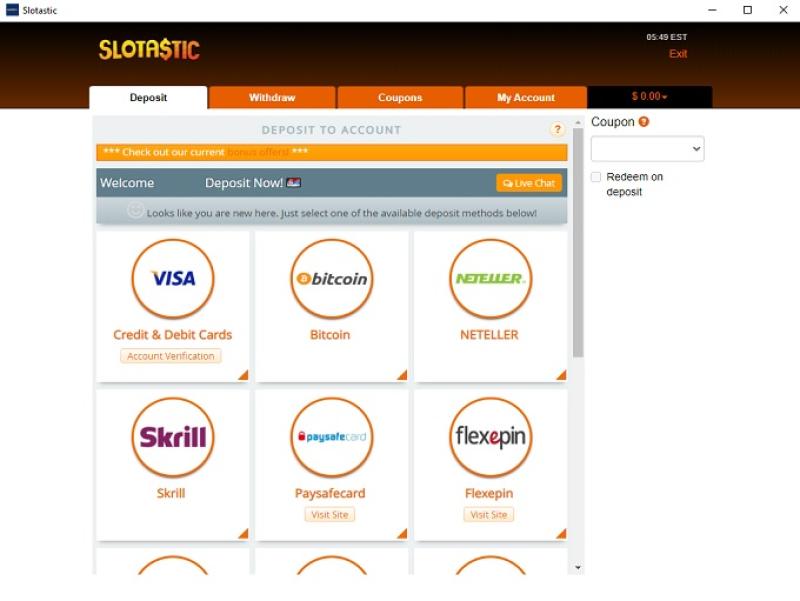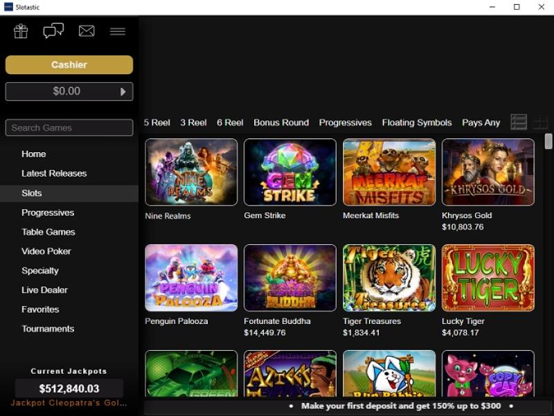 Slotastic Casino は Real Time Gaming and Spinlogic Gamingによって運営されており、Web ベースのプラットフォームとダウンロード可能なソフトウェアの両方を通じて、カジノに数十のライセンス ゲームを提供しており、ゲームをコンピューターに直接インストールできます。