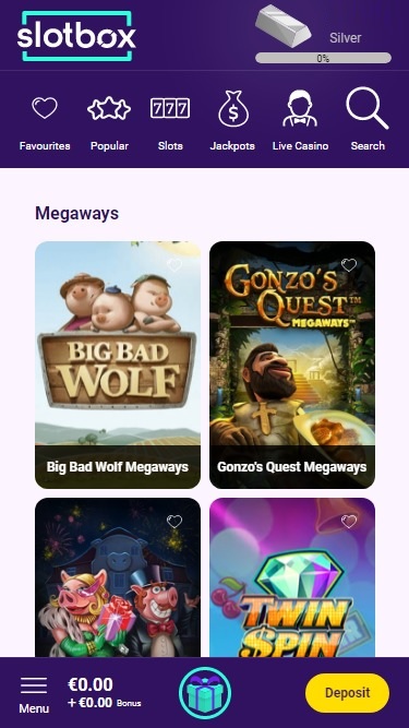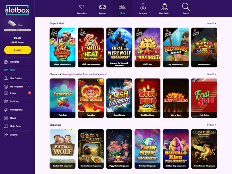 Slotbox カジノでは、ボーナス購入、大当たり、神話、アジアテーマ、動物、映画、テレビなど、数多くの素晴らしいスロット カテゴリーをお楽しみいただけます。